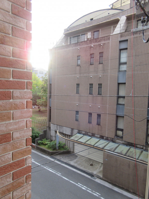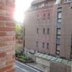 部屋の窓から城東公園とビルが見えます