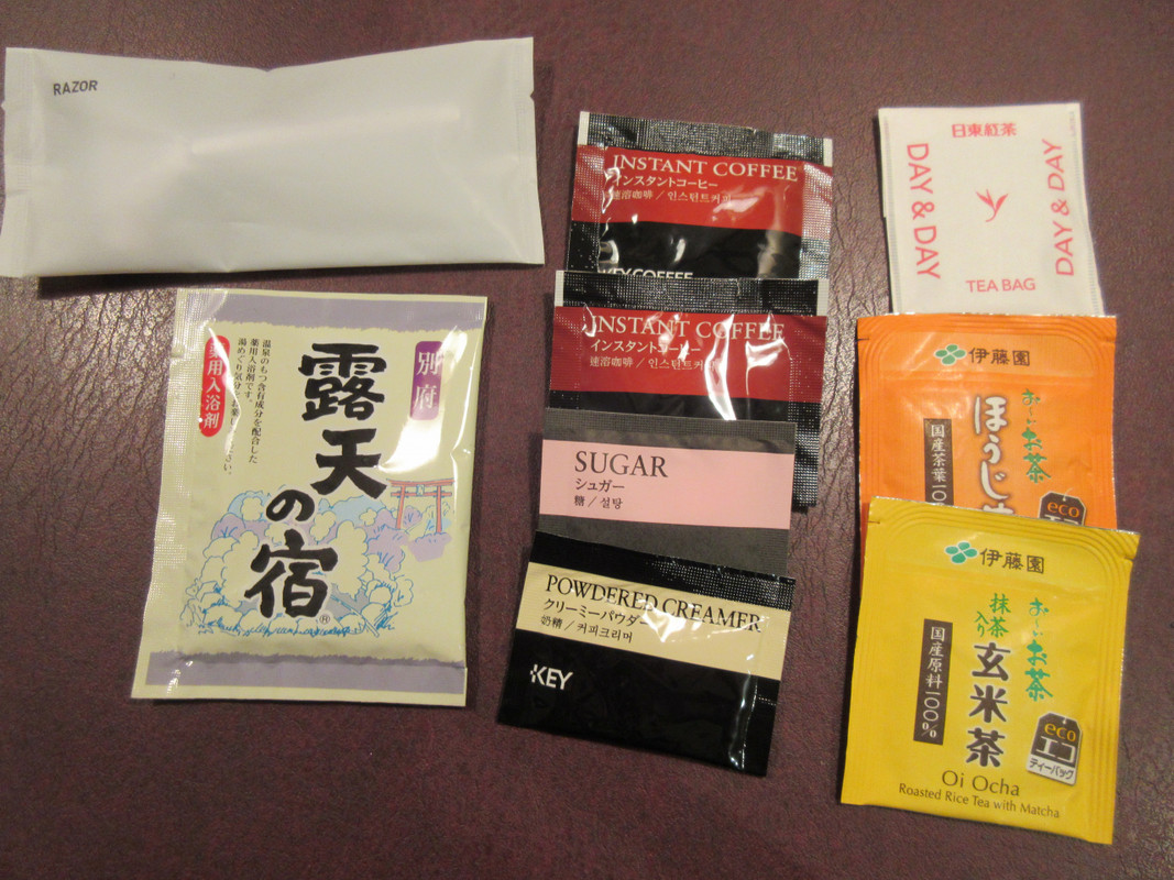サーボス面で良い点に、フロント横に自由にいただけるアメニティが思ったよりも豊富です。インスタントコーヒー、シュガー、クリーミーパウダー、紅茶、ほうじ茶、玄米茶の他に、入浴剤も各種あって日替わりで種類を変えて利用しました。飲み物や入浴剤で、日々雰囲気を変えて楽しむことができました。