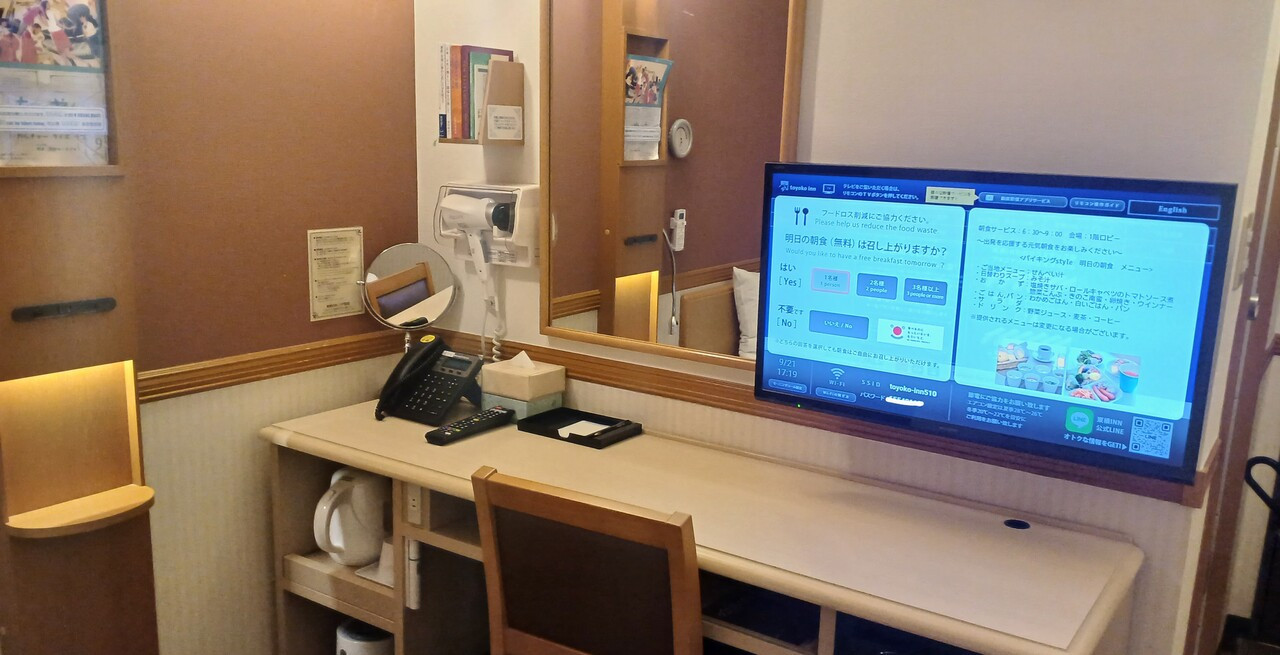 喫煙の部屋ですが、キャンセルがでたのか運よく予約できたお部屋です。街道歩きに荷物を置いて連泊したかったので、駅からの立地付近のコンビニ等はかなり便利だと思います。只、普段禁煙の部屋利用です。正直匂いはかなりきつかったです。(最近のビジネスホテルは喫煙でも換気がしっかりできているお部屋が多いのですが。)部屋には消臭スプレーが有りますが、1/3ほど使いましたが消えず、1晩窓を開けて寝ました。翌日近くで消臭ビーズを購入し置いたら少し消えましたので、喫煙しか空いていなかった方には消臭ビーズお勧めです。食事は和食中心の無料提供メニューです。魚・肉が入った総菜・野菜の総菜は毎日メニューが変わりますが、卵は毎日厚焼き玉子でした。朝はパンの為、卵料理も毎日アレンジしていただけると最高です。