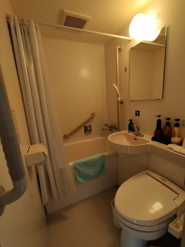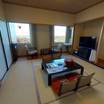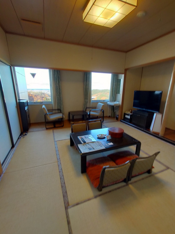 和室802 床の間と広縁でした。 最初に目についたのは 畳が古かったことです。 大体の宿は 建物が古くても畳は変えているところが多いですが ここの畳は 茶色くて年季が入っています。 ソファーや畳にもシミがあります。 壁やソファー 床などは多少 仕方ないと思うけど 畳は新しい方が気持ち良いです。 良い点は テレビが大きいことです。近くにスーパーがあるのも便利です。 こちらのホテルも日帰り温泉を併設しています。