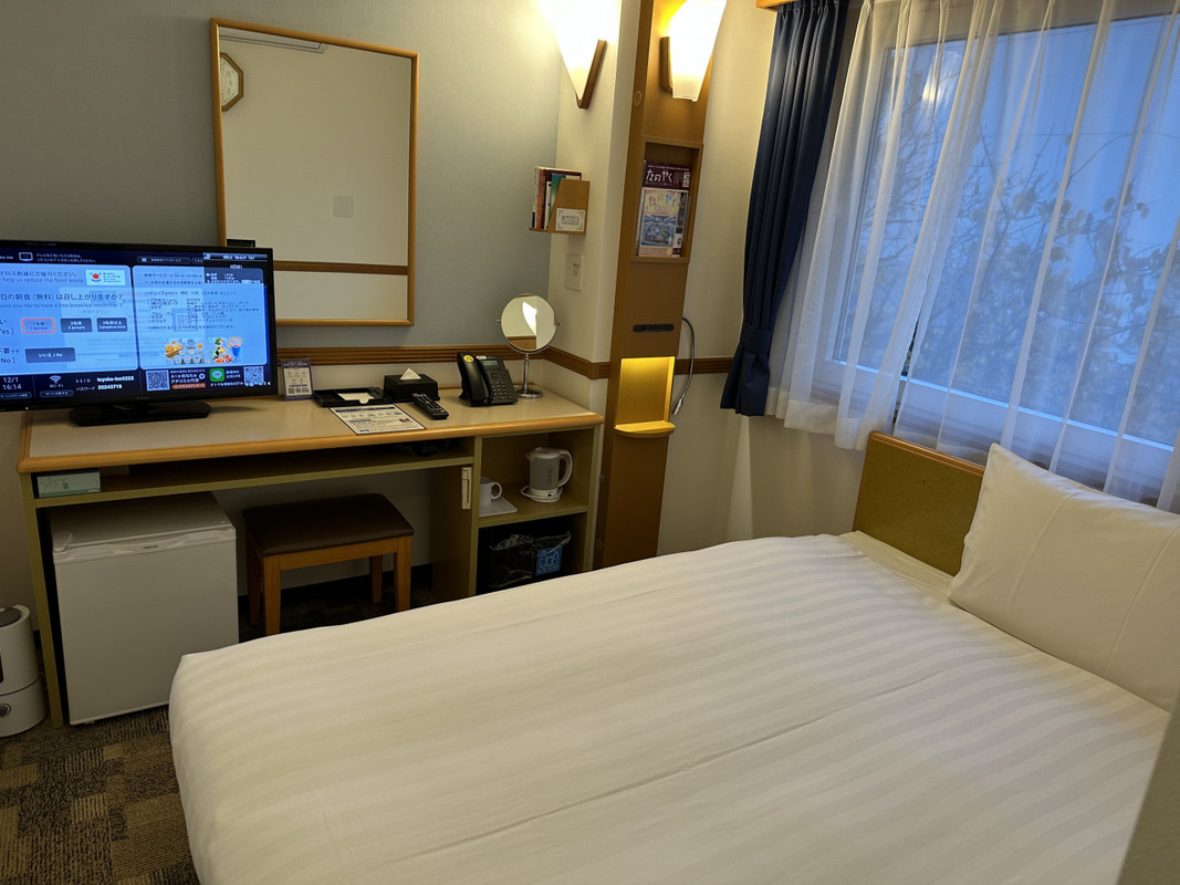 出張先からとても近いので二泊利用しました。ツインルームに宿泊したのですが、部屋は別途で占められていて、フリーなスペースはあまり無かったです。荷物が多い人には向かないと思います。最寄駅の門前仲町駅から少し離れているからか、他のホテルよりもリーズナブルでした。その他は他の東横インと同じですが、朝食時は一階会場は外国人観光客で混んでいました。