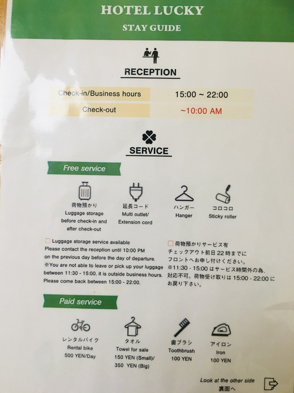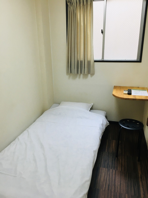 路地裏のアパートのような外観で、フロント横には椅子があり、電子レンジ、湯が入っているポットがありました。部屋はシンプルでベッド、ミニテレビ、ミニ冷蔵庫があるだけで、タオル、歯ブラシ類は有料で販売しています。シャワーは24時間利用可能で、風呂は時間制でシャンプー、ボディソープ付きです。部屋から隣の人の声や廊下の物音が聞こえました。wifiが繋がります。