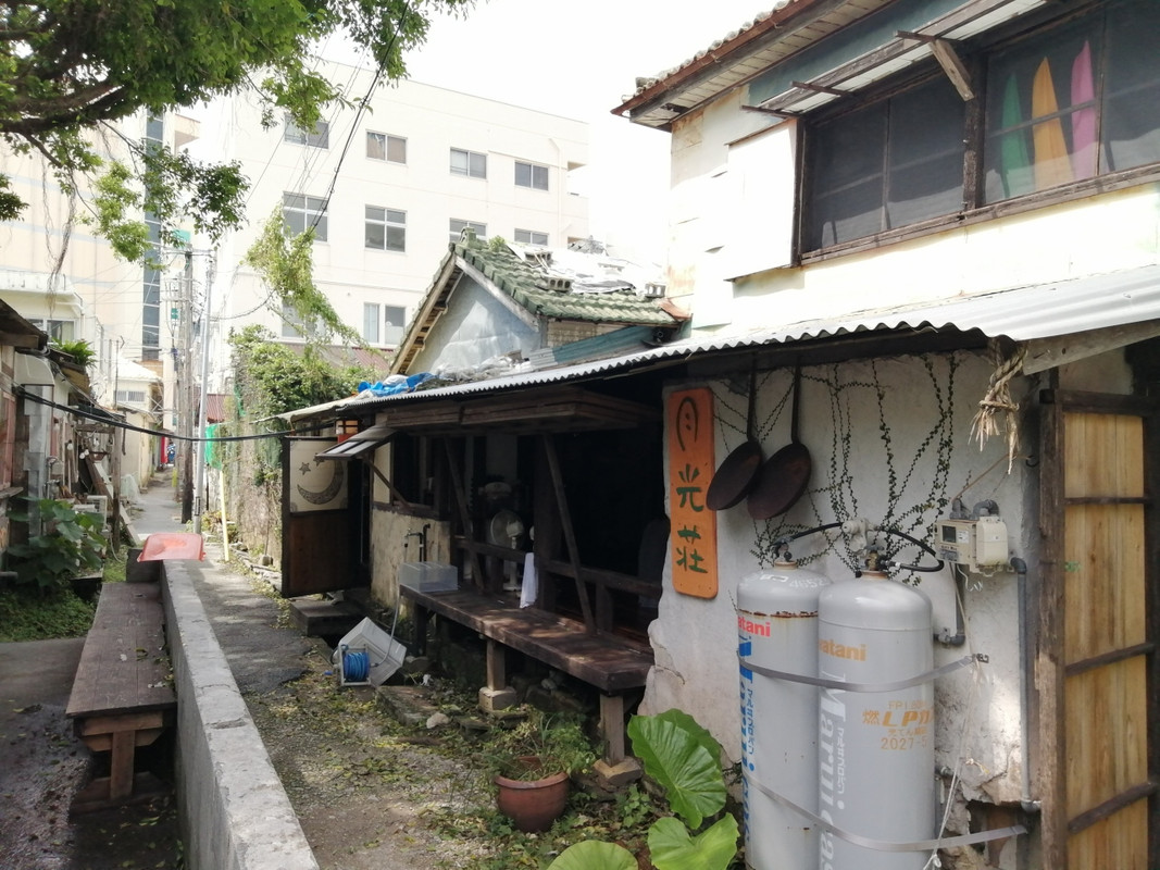 那覇の中心部なのに緑ヶ丘公園の森に接しているため超ワイルドな環境です。味わい深い建物ですがとてもちゃんとしています。ドミに泊まりましたがゆったりした造りでベッドも広く、各ベッドにはコンセント、ライト、カーテン、扇風機完備。共同トイレ、シャワーもとても清潔で最高水準のドミだと思いますが1泊2500円ほど。ドミの値段としては那覇ではかなり高めなので当然と言えば当然かも。昼間は明かりを付けなければ真っ暗のいわゆる“穴蔵ドミ”なのが難点。気持ち程度の共同キッチンでコンロはなく、カセットコンロのガスは有料です。