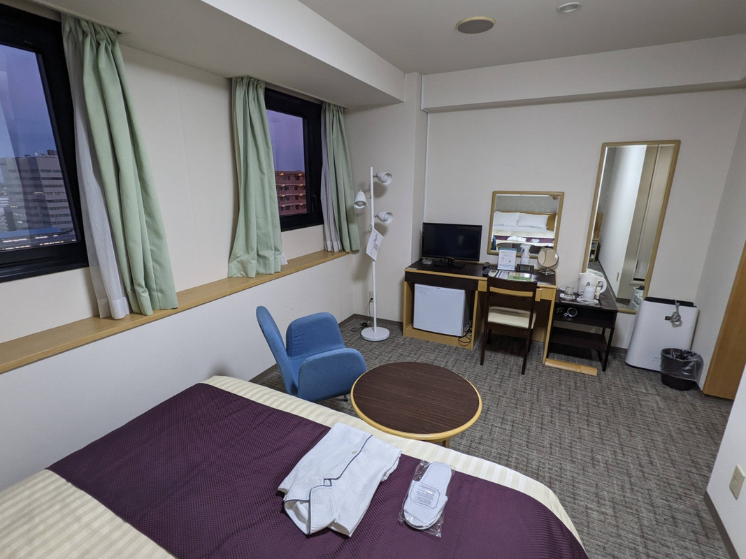 駅の高架歩道から建物に入れるので、高崎駅ほぼ直結といってよい。周囲に飲食店はいっぱいあって便利です。群馬県民割でお得に泊まれました。25平米のダブルルームで広くてゆったりできました。変わったところでは青竹踏みがお部屋にありました。