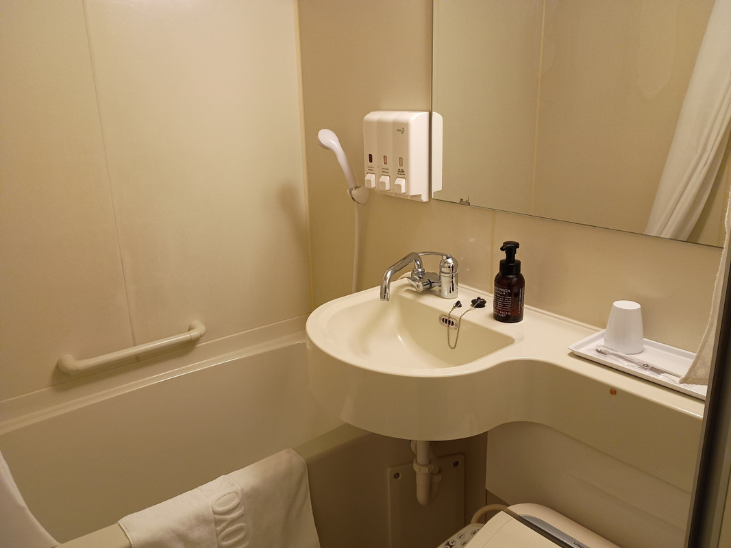 部屋も東横イン標準の安定したもの。コンセントも枕元にあります。水回りも東横インでは標準的なものです。