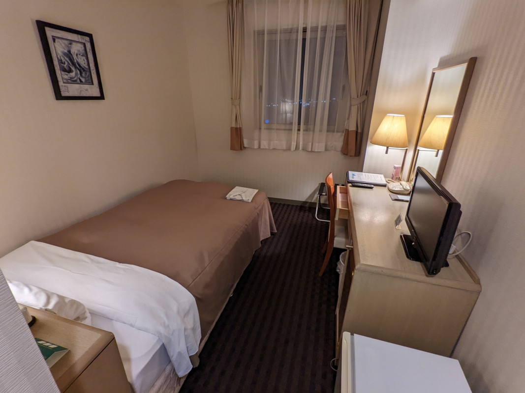 夜遅くにチェックイン、早朝チェックアウトだったため割り切って、いつも使っているyahooトラベルの中で一番安いホテルをチョイスしました。安いと言っても東京のホテルと比べると高い。アクセスはあまりよくなく、駅から10分以上歩く。深夜なので大変。部屋はよくある地方のホテル。水回りは古臭く、お湯の出が悪い。