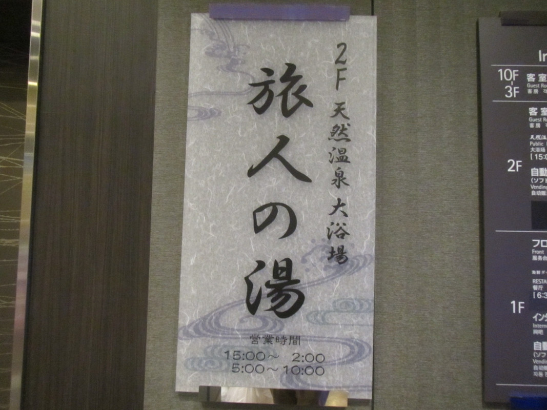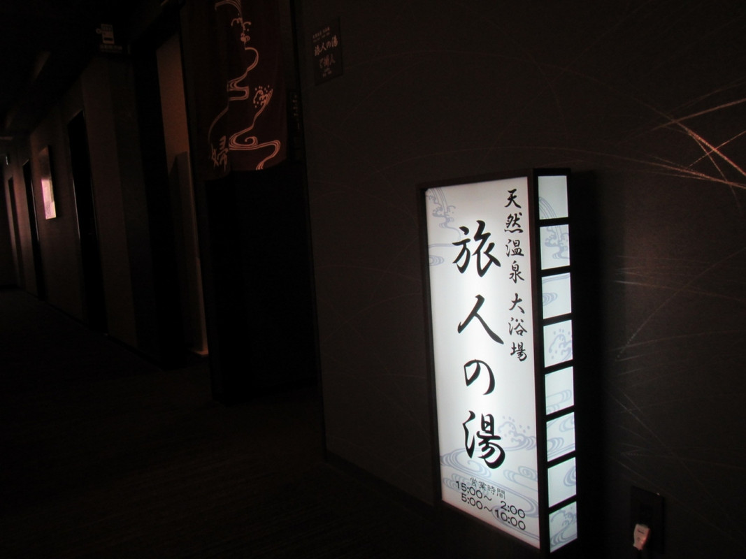 2階にある大浴場は、日帰り入浴ができないため、宿泊者のみで比較的落ち着いた雰囲気です。カードキー入館で、露天風呂は無く、窓は下半分は垣で覆われ、上半分はガラスにスリが入っていて、外からは見えないようになっていました。pH9.5の肌がツルツルになる泉質で、気分よく入ることができました。貴重品は脱衣場にダイヤルロック式の収納庫があったので、100円玉を持って行ったり、鍵を腕に付けたりする必要はありません。近くにあるドーミーグループのホテルも大浴場が特徴的ですが、そこよりも大浴場に広さがあり、寛げました。