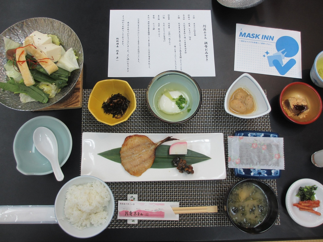 少し離れている2番館のお風呂にもはしご湯しました。温泉の繁華街からは少しはされて街歩きは出来ませんでしたが、静かに過ごせました。夜の月明りで遠くに阿蘇の山々の方に思いをはせました。屋上の展望露天風呂から田舎風景を見られました。東京オリンピックの開会式をスマホで見ながら夕ご飯の懐石料理をいただきました。