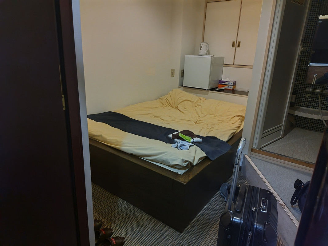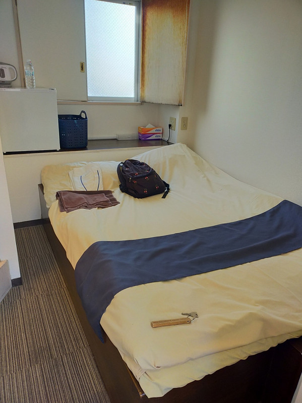 狭い部屋に不釣り合いに大きなダブルベッドがあるので、大きな荷物があると置き場所に困るでしょう。