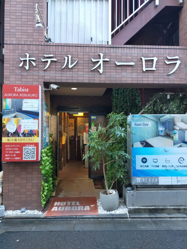 池袋駅から徒歩7分くらいの場所にあるホテルオーロラ。チェックインを終えてエレベーターで上がるとマンションの共用スペースになっており、部屋はまさにマンションの一室。部屋を開けるとすぐそこにベッドがありスペースは少い