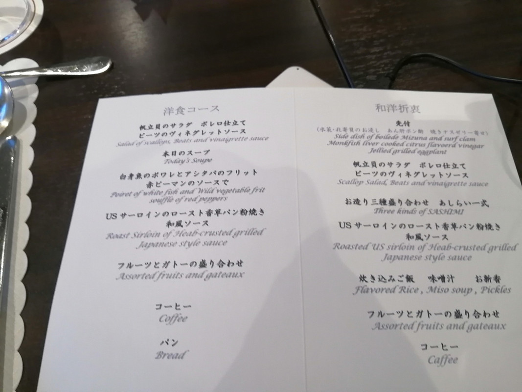 連休に宿泊したところ、従来ビュッフェスタイルのサービスだったダイニングが、定食がサーブされる形式に変わっていた。食事自体は和洋折衷か洋食の2種類からの選択だったが、メインの牛サーロインハーブパン粉ローストと前菜の一つホタテのカルパッチョのようなサラダは同じで、それ以外で差がついていた。家族と別メニューにして食べ比べてみたが、いずれも満足できるものだった。