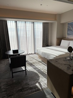 一人で宿泊するには勿体ない部屋でした。最大の魅力は高層階(宿泊階23F)からの眺めかな。KITTEビルの上層階がホテルなのだが、まずはホテルの入口を探すのが大変、隠れ家的な入口から入り21Fのフロントへ。部屋は新しいので快適。特にバスルームがお洒落。冷蔵庫のドリンクはフリー、ミネラルウオーターは1Lが2本、WiFiがフリーなのがちょっと気になった。