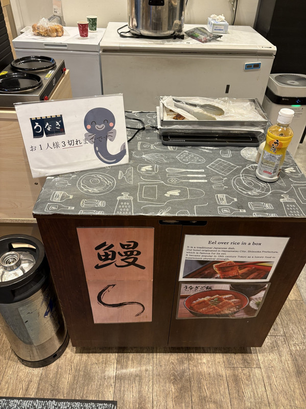 朝食は目玉が鰻とのことだが一人3切れと制限あり。品数もそれなりにあっていいが、有料と考えるともう少し品数、クオリティが高い、うなぎの切れ数がもう少し多くてもいいのではないか。1 / 5