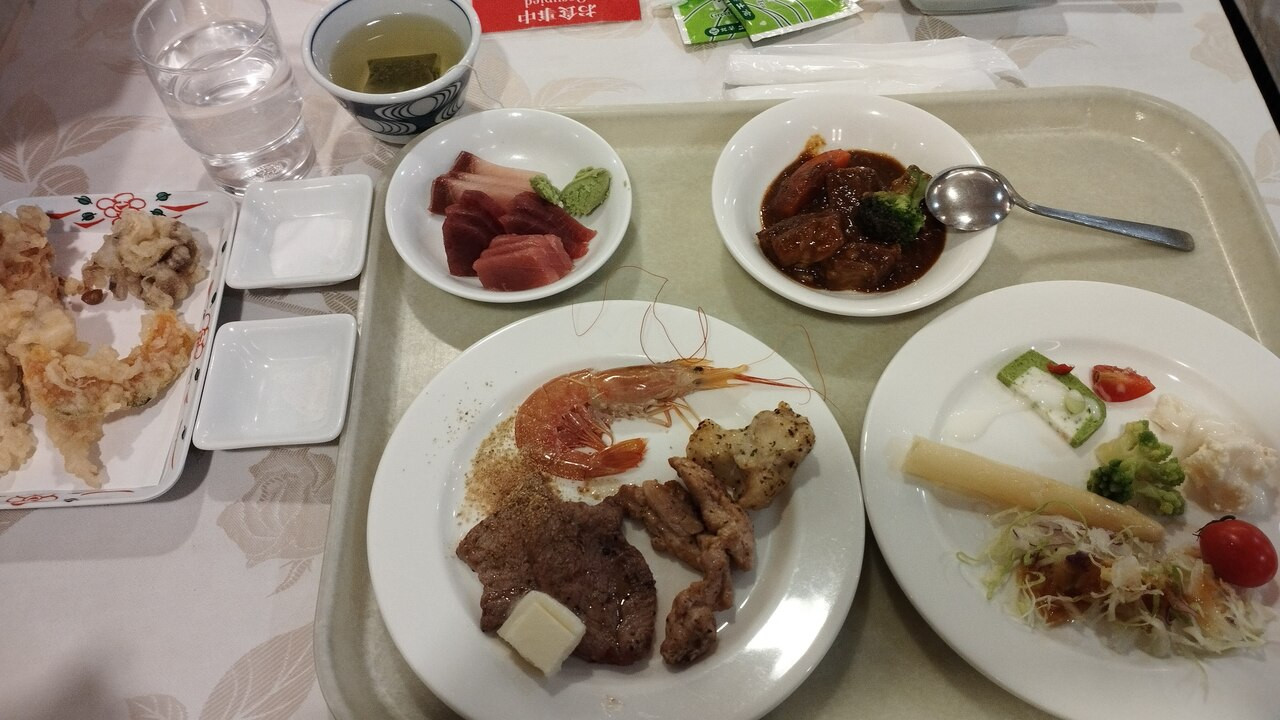 夕食はバイキングでしたが、炭火焼コーナーで、ステーキや鶏肉を焼いてくれていたのが美味でした。それ以外にもお刺身、天ぷら、ビーフシチューなどメニュー豊富で味も良かったです。鹿バラの塩蒸しも絶品でした。1 / 1
