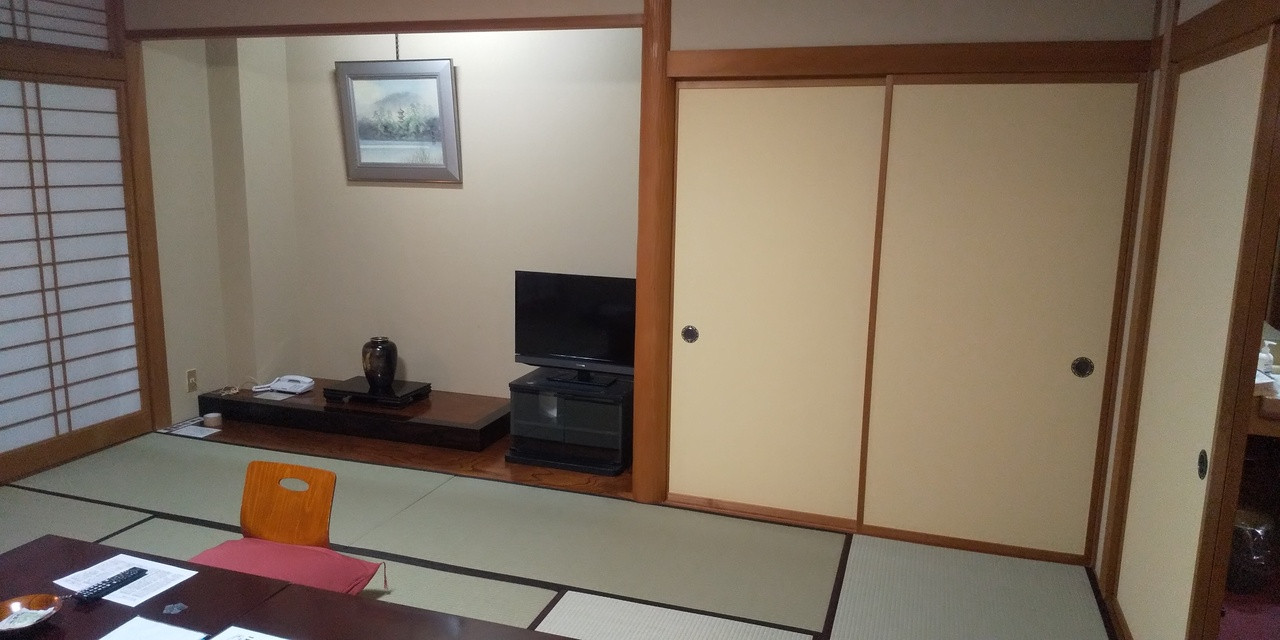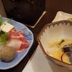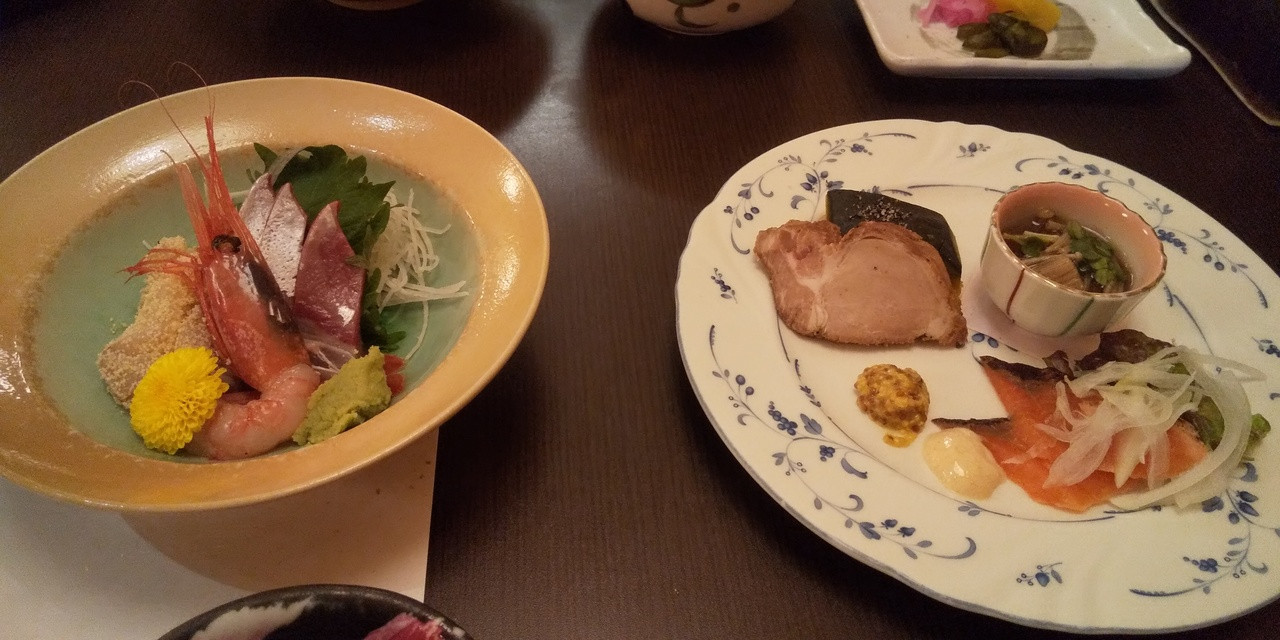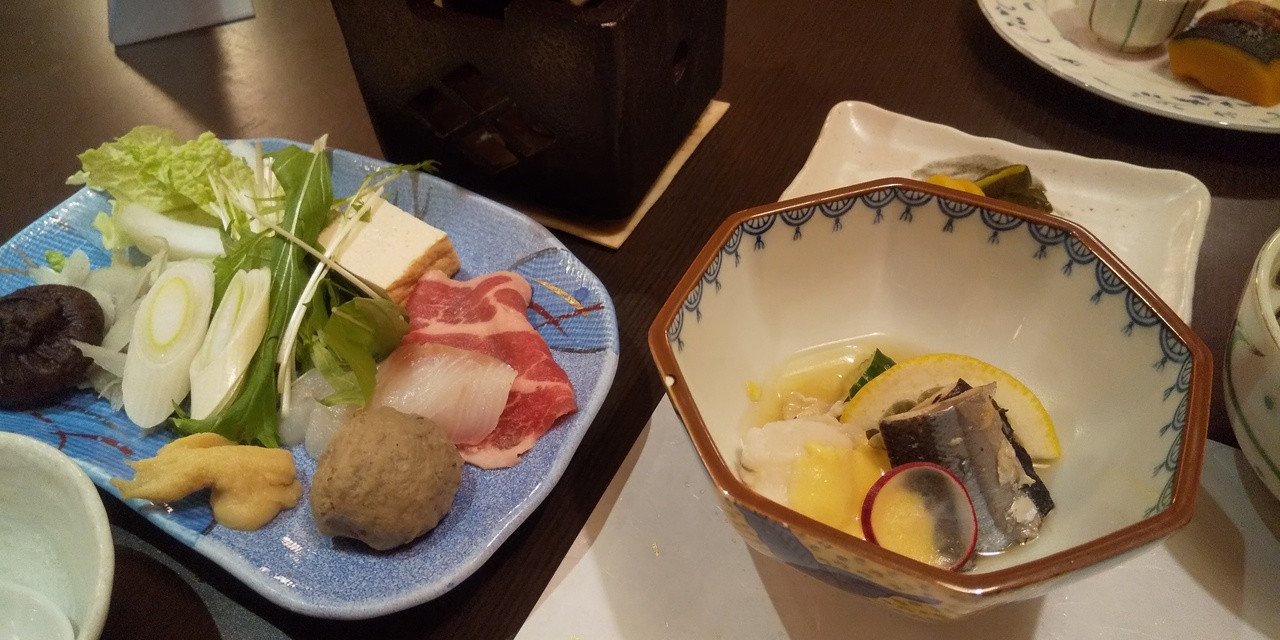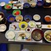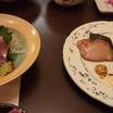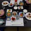 食事は、中広間曲亭にて。畳の上に大きめのテーブルと椅子。隣との空間も十分ありました。地元と素材を使っているのはわかるけど、お品書きがないのが残念でした。