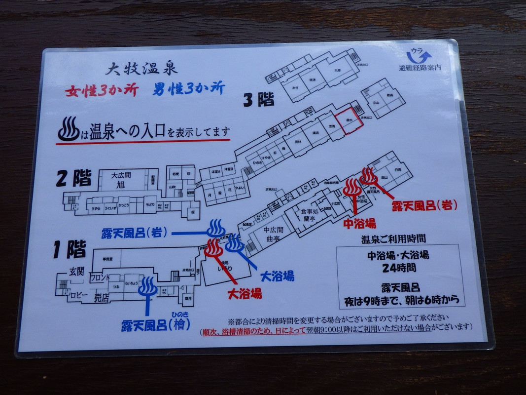 温泉は男女それぞれ3カ所。露天風呂は館内から外(ほぼ山道)を歩いていかなければなりません。山の中なので、一人ぼっちは・・・。大浴場は階段の上り下りがあるうえに設備が古くて・・・新しくて眺めのよい中浴場をリピートしました。