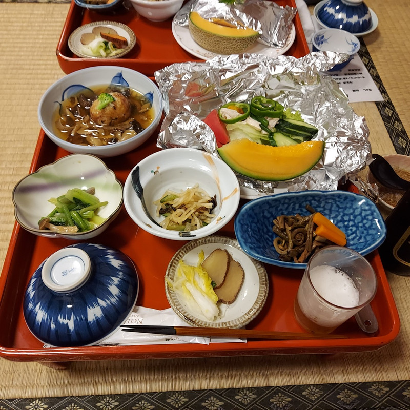 夕食(18:00~)は部屋出し。部屋出しなんて何年ぶりだろう、などと思いながら待っていると、田沢湖名物「山の芋鍋」を始め、山菜料理などの郷土料理が運ばれてくる。派手さはないが、出来立てなので、どれもみな美味しい。中でも岩魚の塩焼きは美味。たっぷり1時間半をかけての食事が終わる頃には、お腹も気分も満ち足りる。