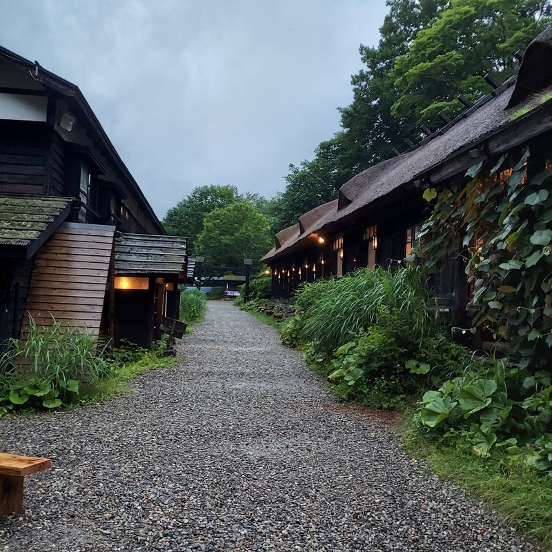 4月下旬というのに、雪が残るダート道の果てに、関所のような門が見えてくる。入口の門を入ると、江戸時代にタイムスリップ。茅葺き屋根の長屋が並ぶ小路を浴衣を羽織った湯治客が歩いている。女性客が多い。