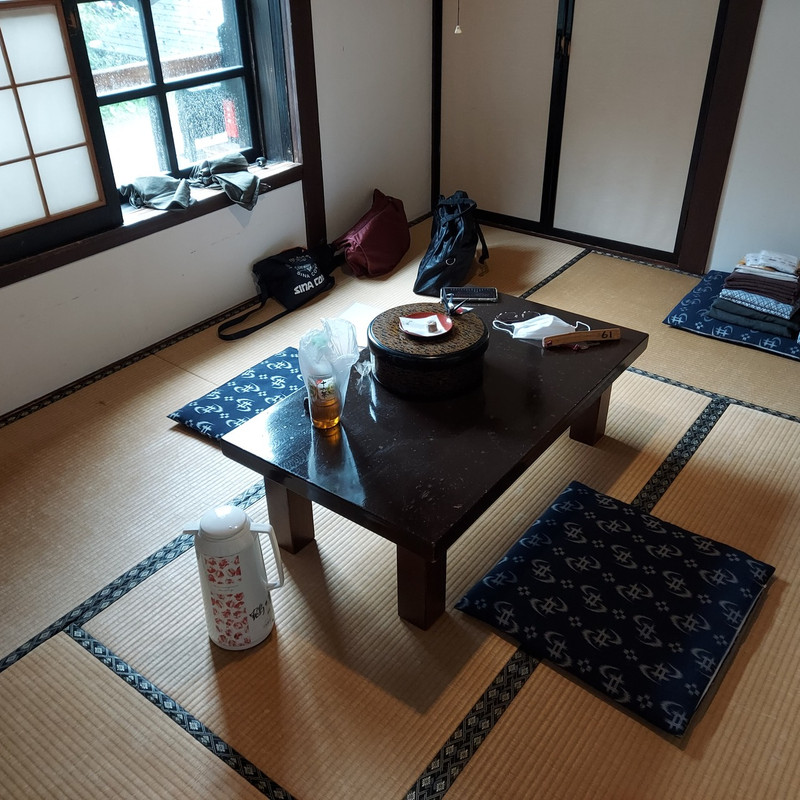 和室は懐かしさ漂う造り。広縁には椅子2脚とテーブル、窓は昔ながらのガラス窓。カーテンがあるだけなので、ひんやりする。冬の寒さはいかばかりか。広縁と客室との間が障子になっているので、広縁全体が断熱空間。トイレのドアもレトロ。無料WiFi、ポット、金庫はあるが、冷蔵庫がないので注意。テレビもないが、俗世から暫し離れるのもまたよし。