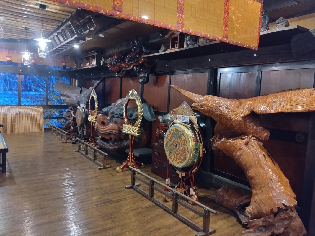 建物の玄関には、狛犬や石像、かがり火などが並んでいたり、大きな天狗の面がこちらを睨んで、まるで古い博物館か、寺社か、怪しい屋敷のような雰囲気が漂っています。