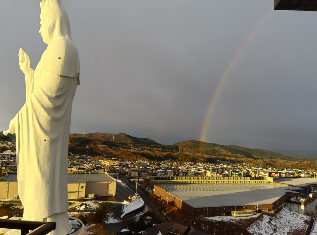 仙台観光のため2泊しました。仙台駅からバスで40分、ちょっと遠いです。近くにイオンがあり便利でした。ゴルフ客が中心のようです。大浴場は併設のスポーツジムのお風呂は、使えますが木曜日が定休日でした。朝目覚めたら目の前の観音様に虹がかかっていて感動でした。