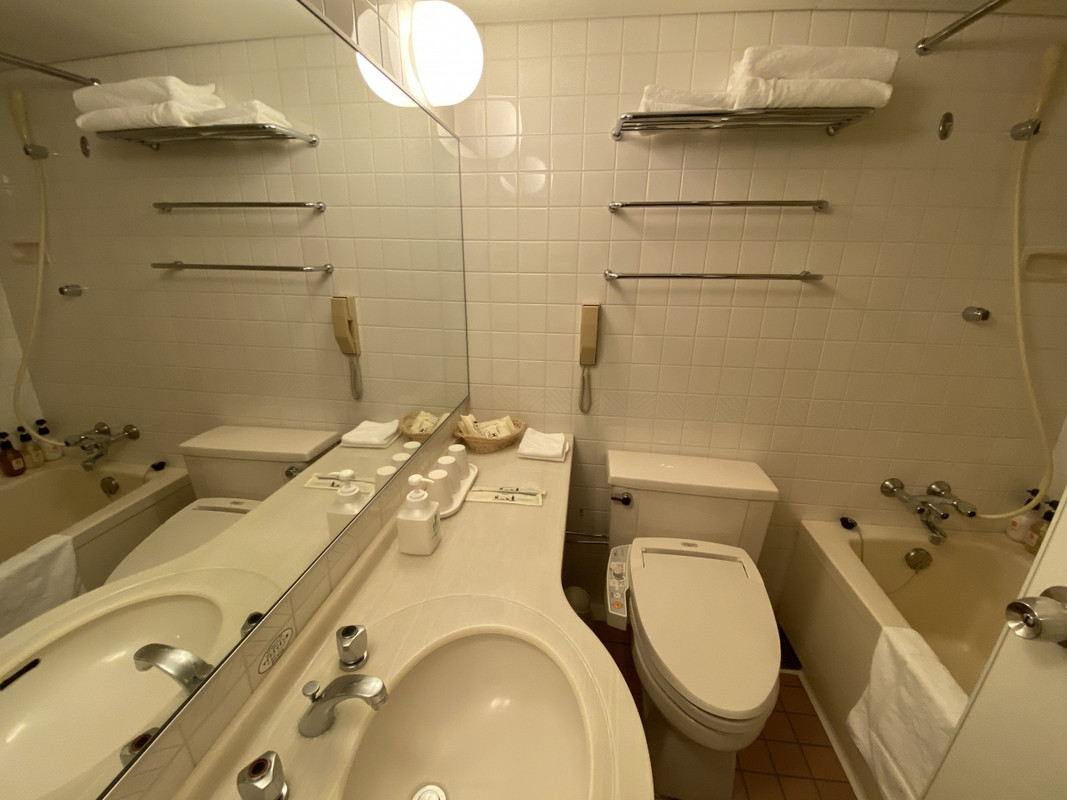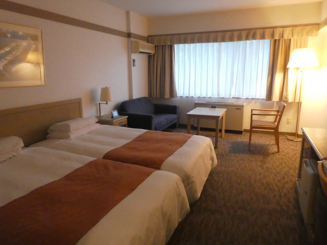 客室はデラックスツインルームは3ベッド対応になっているため、ソファベッドがあるので少し広めです。ただし、窓側からゲレンデ方向は見えません。バスルームは普通並みの広さですが、ウォシュレットが古いタイプのため、便座が暖かくなりません。クーローゼットにはセイフティボックスがありました。部屋着(寝巻き)は上下とも7分の長さなので、冬場は部屋で過ごすには少し寒いかも。窓際に強力な暖房があるので、温度調整できますけど。