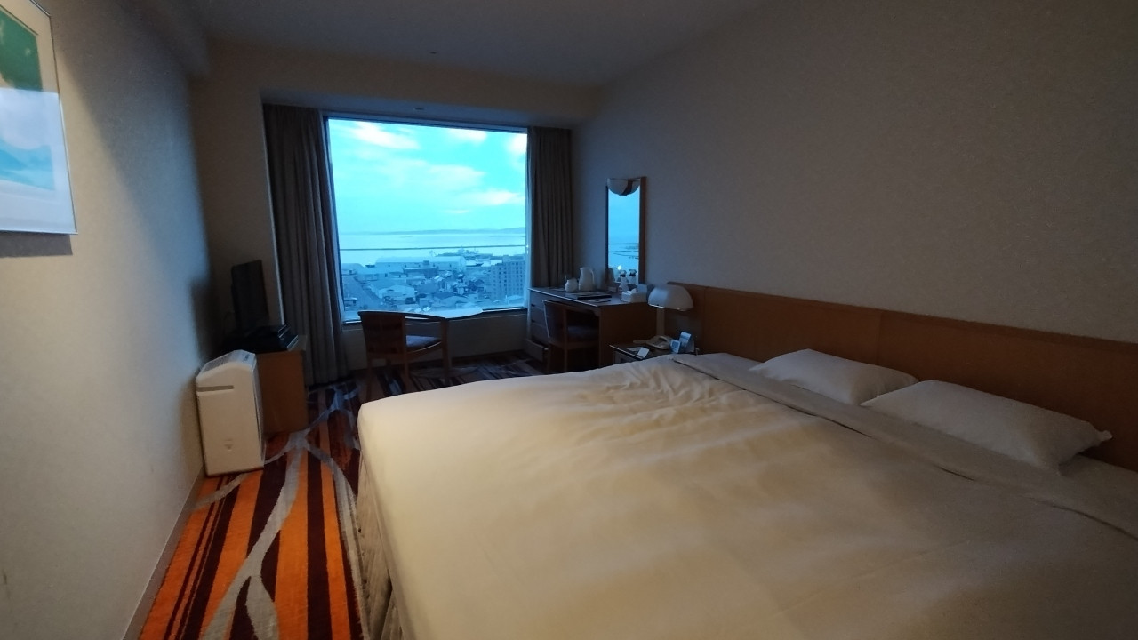 阪急交通社のツアーで宿泊しました。前回はコロナ禍中に10日間のツアーで宿泊していました。部屋は同じく海側でしたが、宿泊階が低層だったので、眺めはあまりよくありませんでした。部屋の造りはプリンスホテルらしい昔のままの物が大切に使われています。そのためベットのマットの寝心地はあまりよくありません。ソファベットも経年劣化を感じます。それと窓が開かないのですが、窓の脇にあるスリットを開けることができますが、換気はあまりよくありません。特にバスルームには換気扇が無いのは致命的です。廊下を歩くと半開きにしたドアを見掛けます。皆さん同じことを感じているのだと思います。残念なのはこのホテルには大浴場がありません。最上階のレストランはガラス張りなので、朝から晴れていると空調はほとんど効き目がありません。宿泊時にも朝の混んでいる時間帯だったので熱気を感じるほどです。温暖化のせいか建設当時と気候も変わっているのではないかと感じます。立地はとても良いのでMOOにも近く繁華街のお気に入りの店をはしごしても帰ってくるのには便利です。空港行きのバスの発着場でもあるので便利さは釧路位置だと思います。JR駅からは遠いですが。