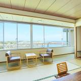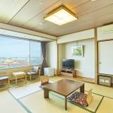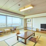 部屋は5階。和室8畳(広縁付、風呂なし・トイレ有、30㎡)の部屋からは、ゆったりとした那珂川の流れと、河口に架かる海門橋、その向こうに太平洋を望む。海門橋の赤が空と海の青に映えて美しい。