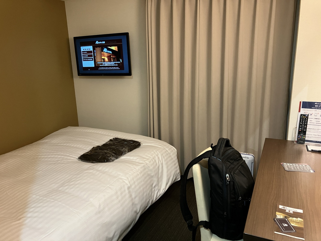 お部屋は狭いめ。アメニティはすべてフロントに、少な目です。