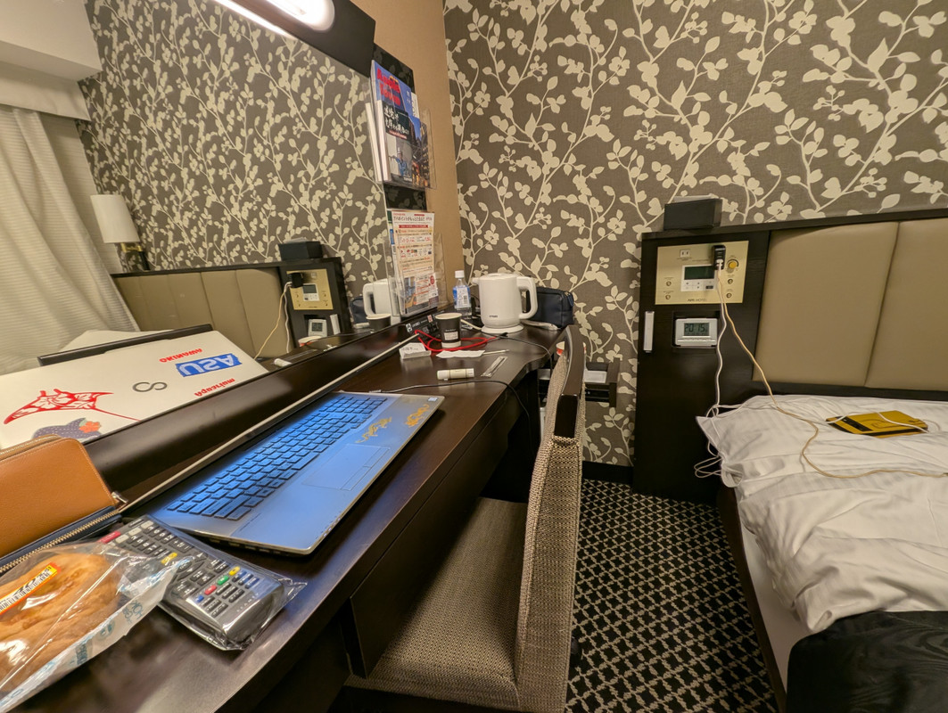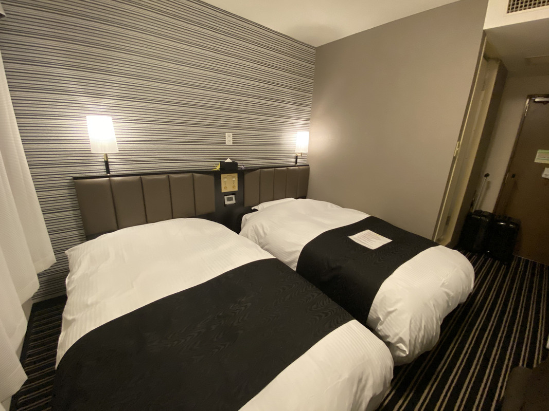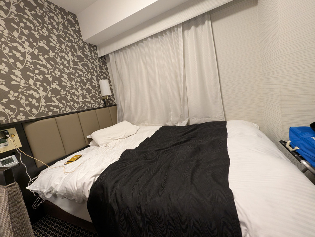 部屋はちょっと狭いかも。しかし通常の広さかと思います。ベットはダブルサイス。