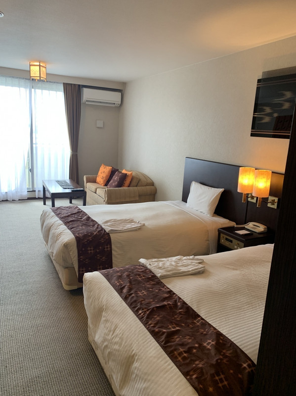建物はやや古さを感じましたが清潔感のあるホテルでした。部屋は2階にあり、同じフロアに大浴場や自販機(ソフト・アルコール)、製氷機、電子レンジ、無料のマッサージ機、洗濯機、乾燥機がありました。