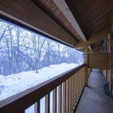 客室は、温泉熱を利用した床暖房が暖か。木を多用したデザインが落ち着きます。窓から雪景色を眺めて飽きません。
