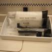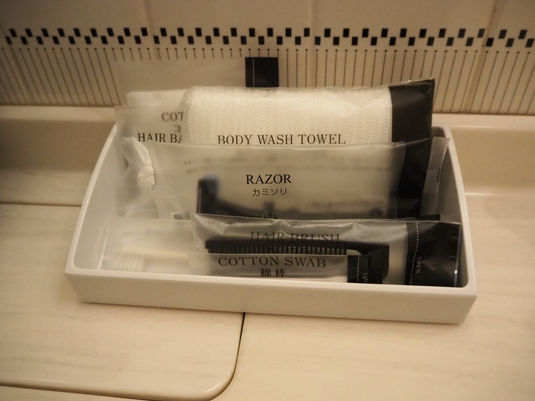 アメニティは基本的なもので、シャンプーなどは備え付け、スリッパは使い捨てじゃない