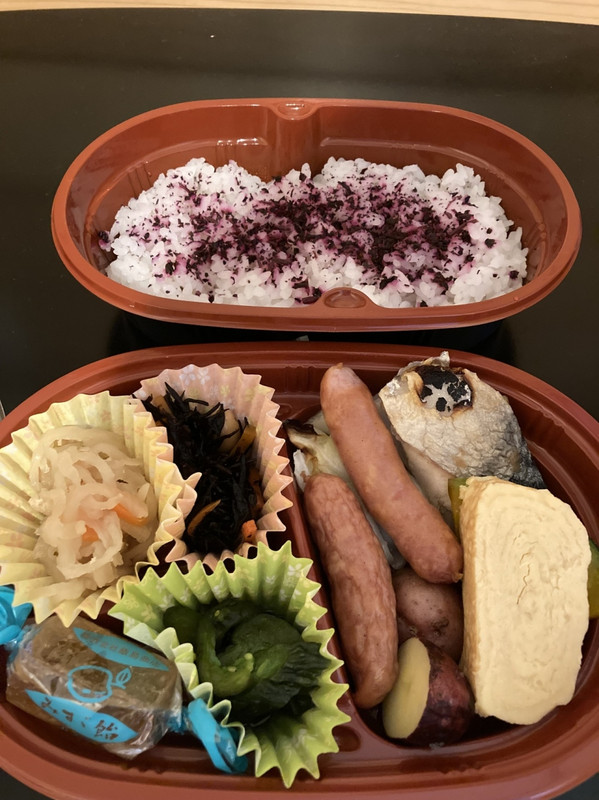 朝食はお弁当にしてもらったが、持ち歩いたらビニール袋の中で液漏れしてた。