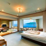 “伊東に行くならハトヤ♪”のCMでお馴染みの「伊東温泉 サンハトヤ」。相模湾に面したロケーションで、露天風呂を備えた特別室や、オーシャンビュー和室からは海景色が望めます。海底1,000mより汲み上げた温泉や、プール、カラオケや卓球台もあって退屈させません。昭和に戻る旅を楽しんで。