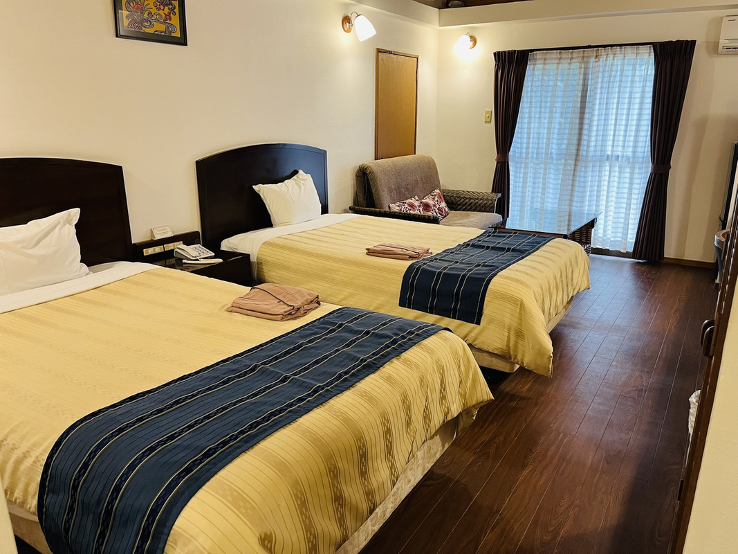 沖縄のビジネスホテルチェーンですが、竹富島は高い建物を建てられないこともあって、平屋の沖縄古民家風になっています。中は広々としていて使いやすいです。電子レンジ、冷蔵庫完備なので、石垣島から食料を持ち込んでも良いかもしれません。一棟独立ではないので、多少お隣の音は聞こえます。