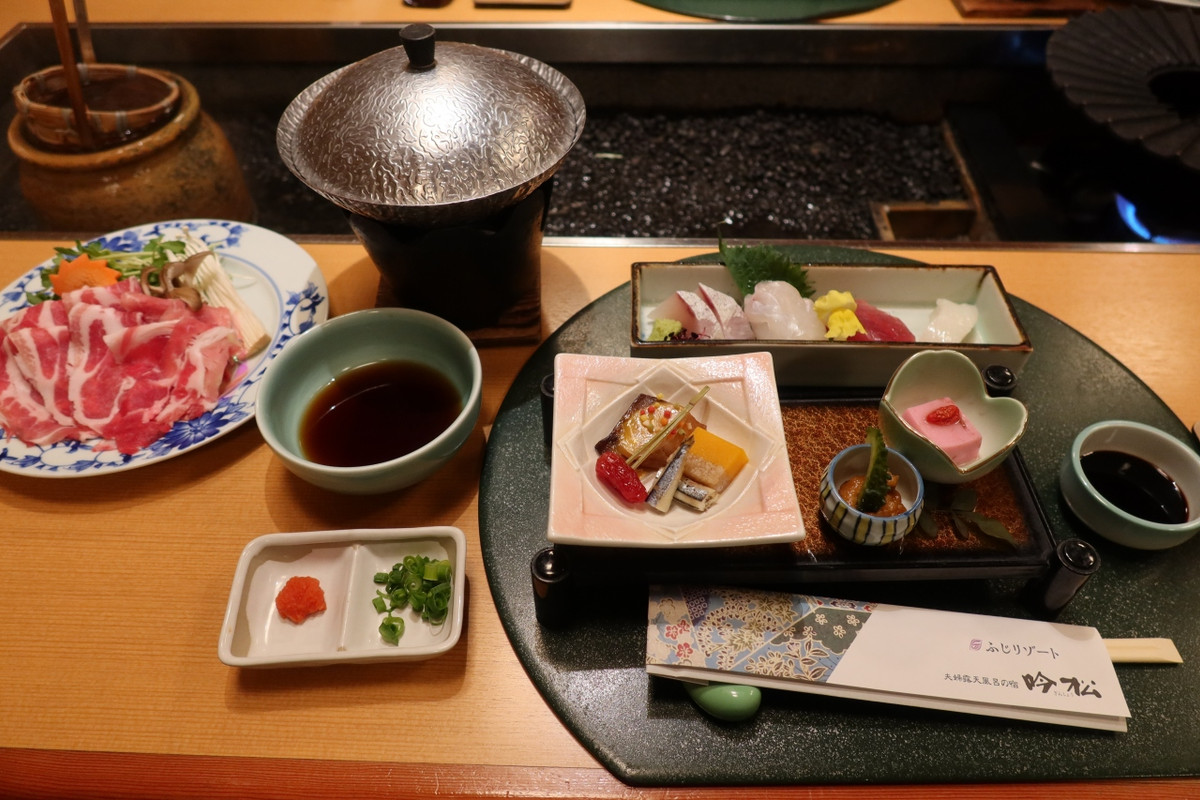 砂むし会館「砂楽」の南側100m程の所に夫婦露天風呂の宿 吟松があります。宿泊したのは岩風呂の露天風呂がついたまどろみツインの部屋。掘りごたつと、まどろみリビングがついており、目の前に広がる錦江湾の海の眺めが良い部屋です。食事は温泉が湧き出る個室部屋で頂きことができ、料理の量も適量。薩摩料理を堪能することができました。