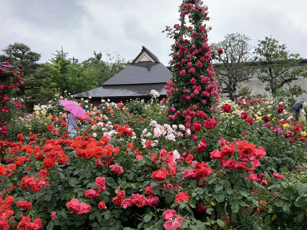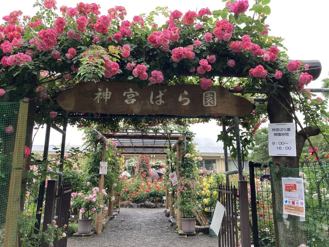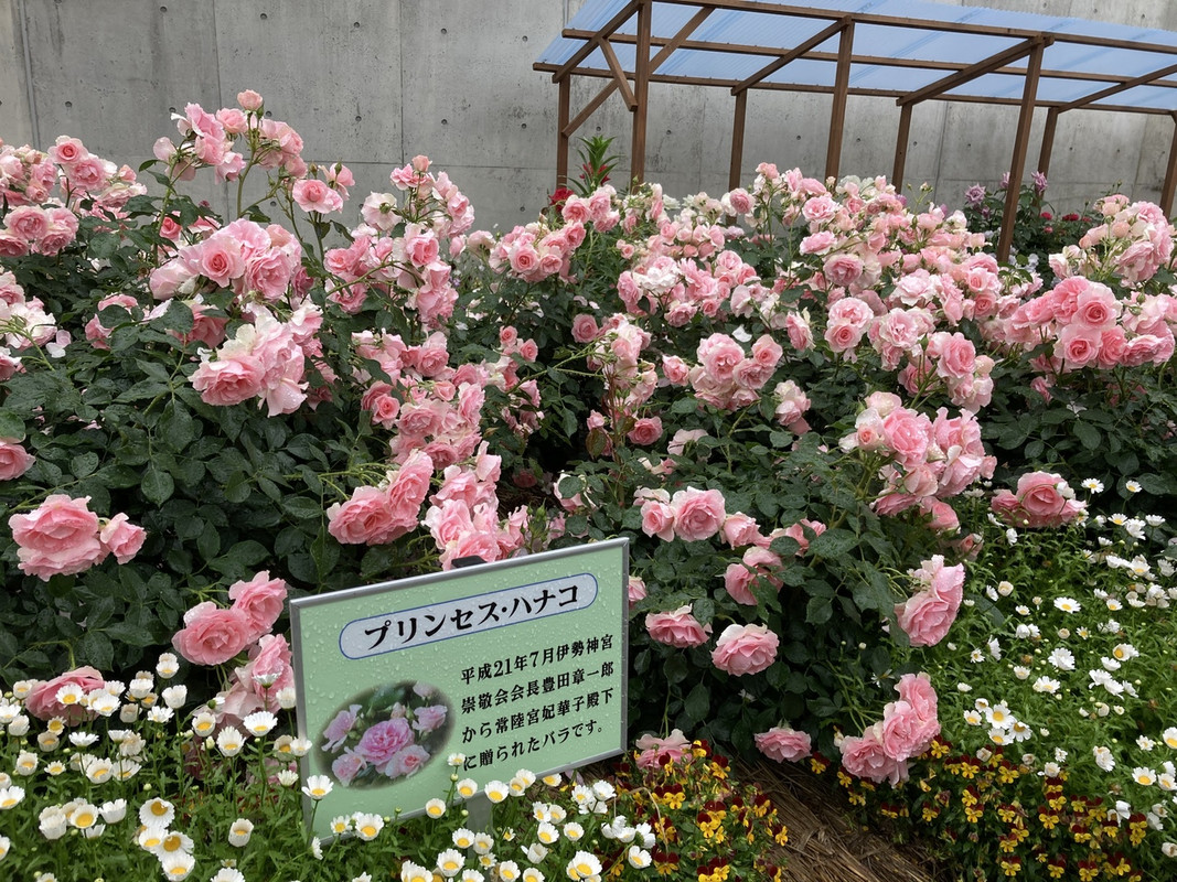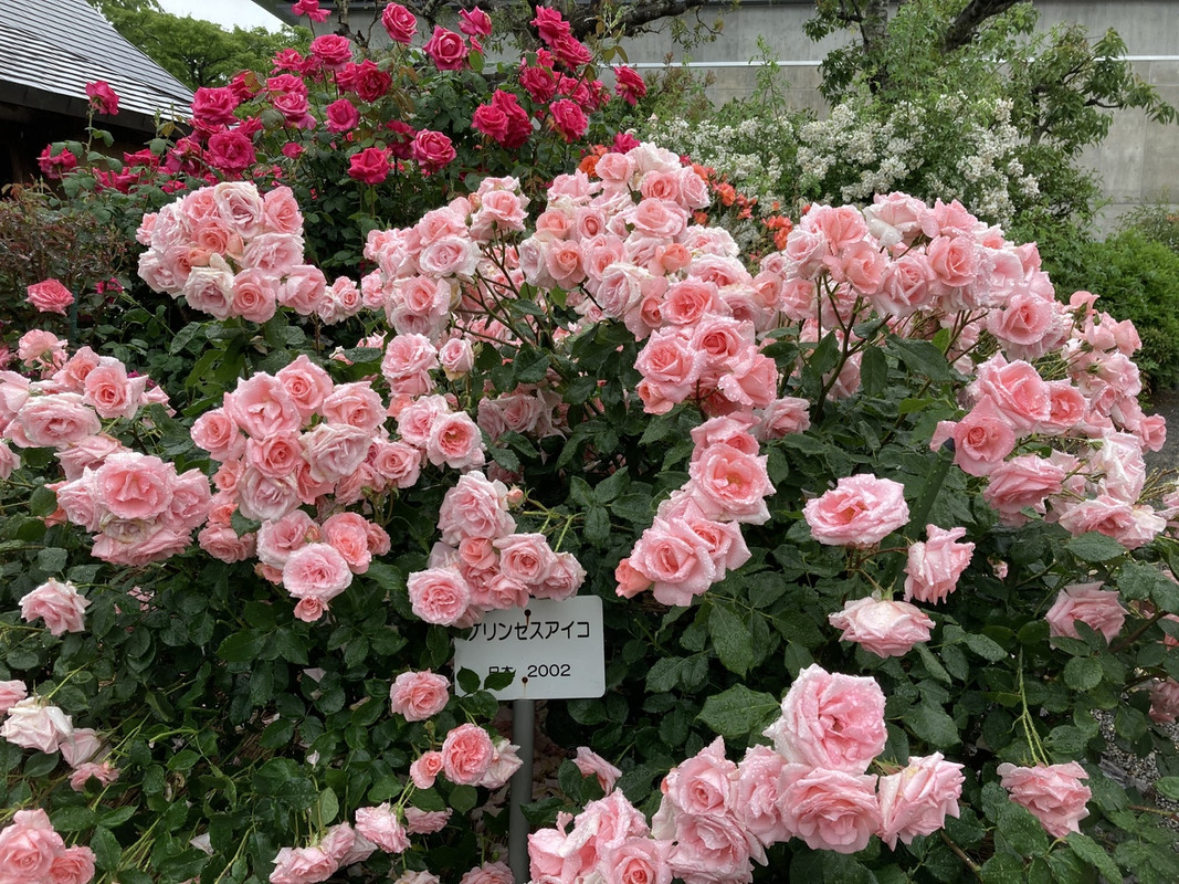 三重県の伊勢神宮近くの神宮会館は宿泊施設ですが、薔薇園を持っていて一般に公開して下さっています。小雨の中、行ったのですが、ちょうど満開で咲き誇る薔薇の景色が圧倒される美しさでした。薔薇の名前に、ピンクパンサーやアンネの思い出と付けてあったり、また皇室ゆかりの施設の事もあり、プリセスミチコ、プリセスマサコ、プリセスアイコ、プリセスキコ、、と付けてある薔薇があったりと高貴な香りにいっぱい包まれてました。プリセスアイコという薔薇は薄いピンクで、満開で、感じる所有りました。雨のじめじめ感を忘れる、花の香りに包まれる爽やかな、ひと時を頂きました。