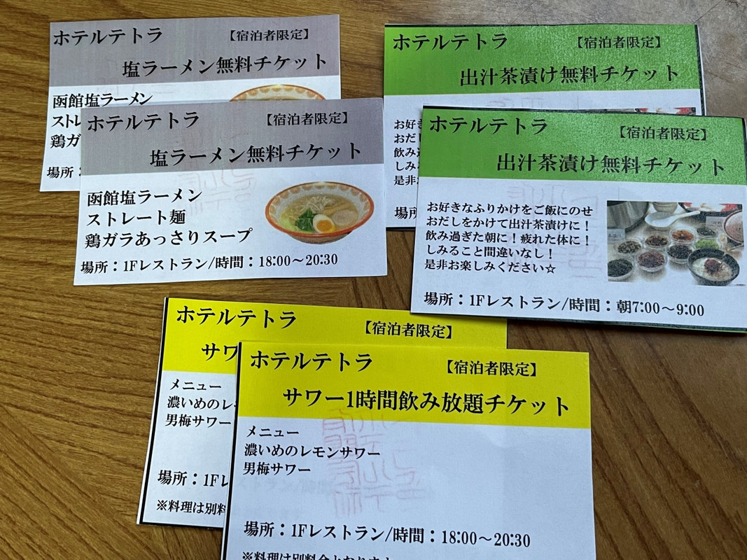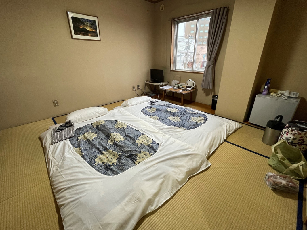 夫婦で和室に一泊しました。古いホテルで本来は2重だったであろう窓は内側が外され1枚ガラス窓になっていました。その為窓際から冷気が入りますが暖房が十分効いていて暖かかったです。2種のチューハイ飲み放題・塩ラーメン(普通の量)・朝のお茶漬けが宿泊者向けの無料のサービスとしてありました。その全てを利用させていただきました。