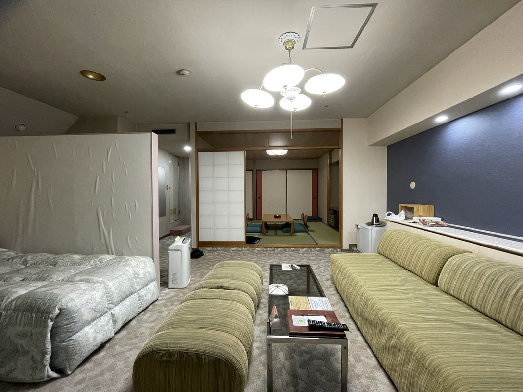 施設はかなり古いですが、広々とした客室が自慢です。和洋室が基本となっており、和室に2ベッド、そしてソファセットがあります。まだコロナ渦の影響で、館内の施設はほとんどクローズしていましたが、売店は元気に営業中です。