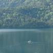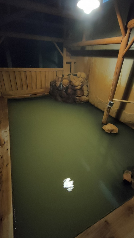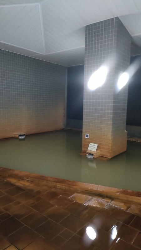 浴室に入ると温泉の匂いがして、緑色の湯がかけ流されています。硫黄とも違う鉄分のような匂いで温泉の雰囲気があります。湖に面した露天風呂もあり景色は良いですが、肩まで浸かってしまうと塀しか見えないのが少し残念でした。温泉成分が濃く、とても良い湯であるのがわかりました。