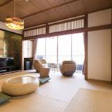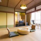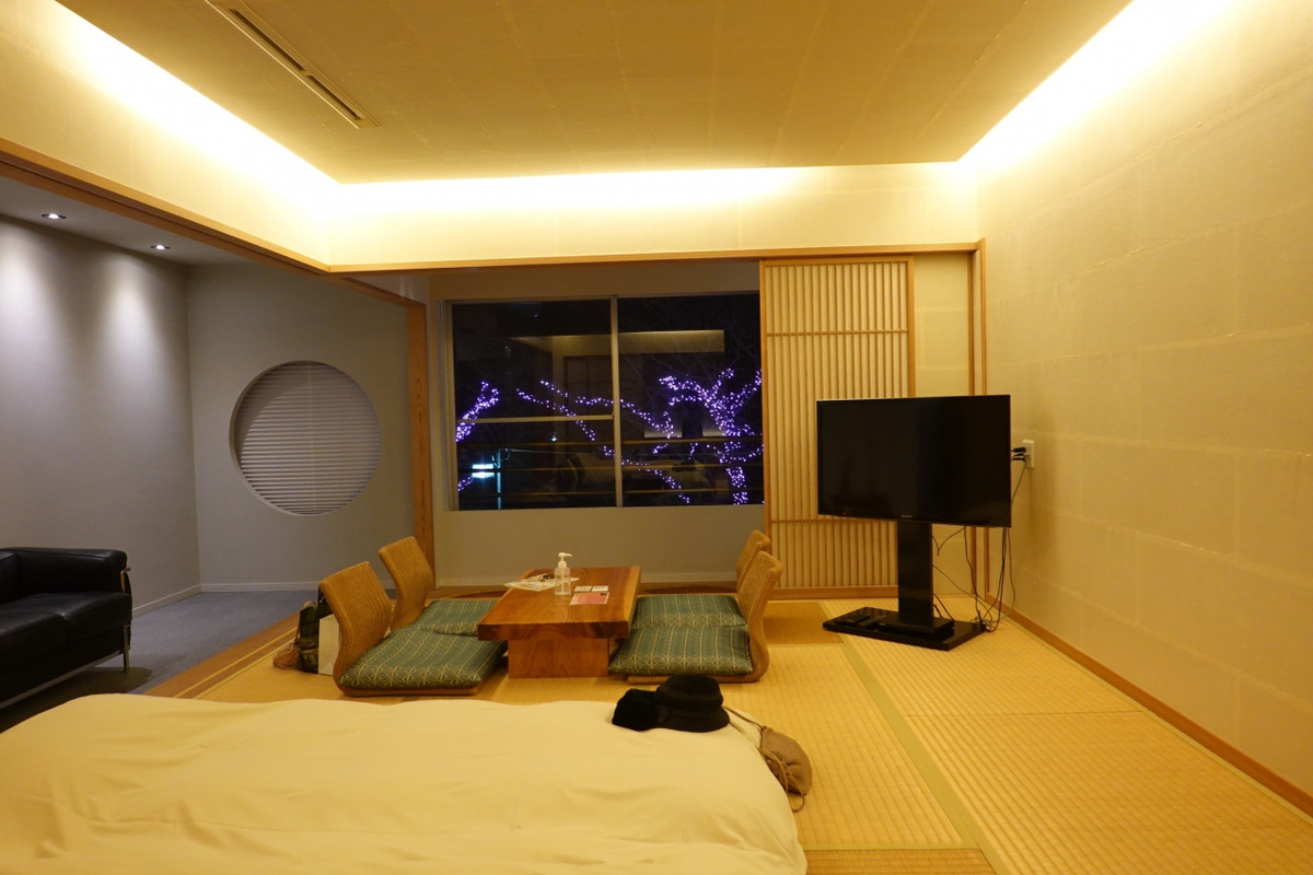 予約の時点で好みに合わせてお部屋を選べます。今回宿泊した「葵」の部屋は、天然温泉掛け流しの檜風呂付き和洋室78㎡。