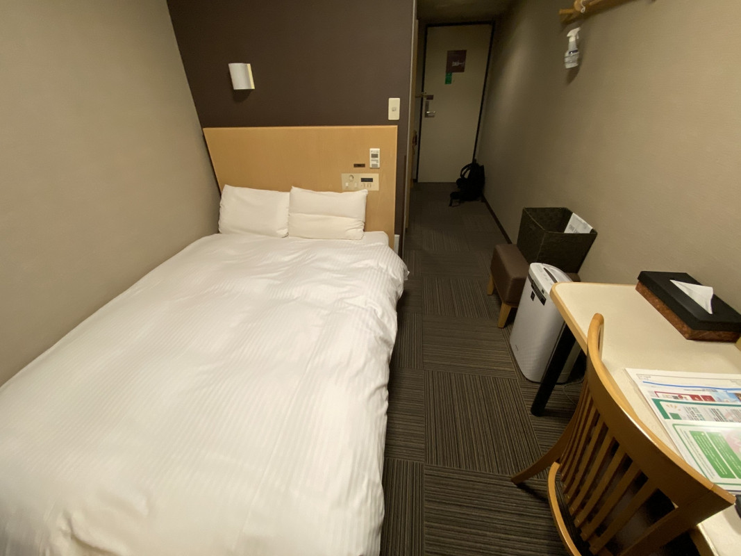 PREMIUMではないドーミーインとしては稚内、北見、姫路、倉敷に宿泊経験ありますが他は全てキャリーケースを広げても余裕がありました。キャリーケースを壁に立てかけて広げ部屋を歩く際は跨がねばならない狭さは同チェーンでは初めてでした。