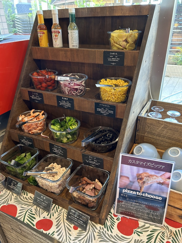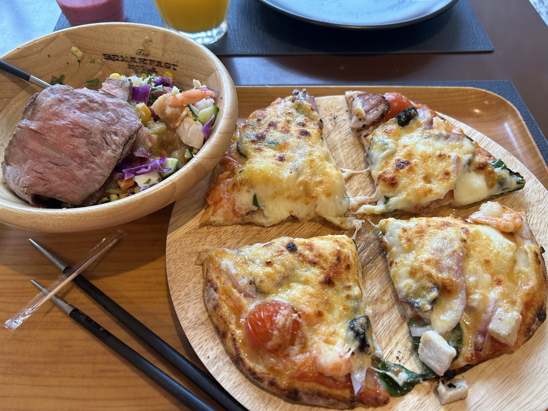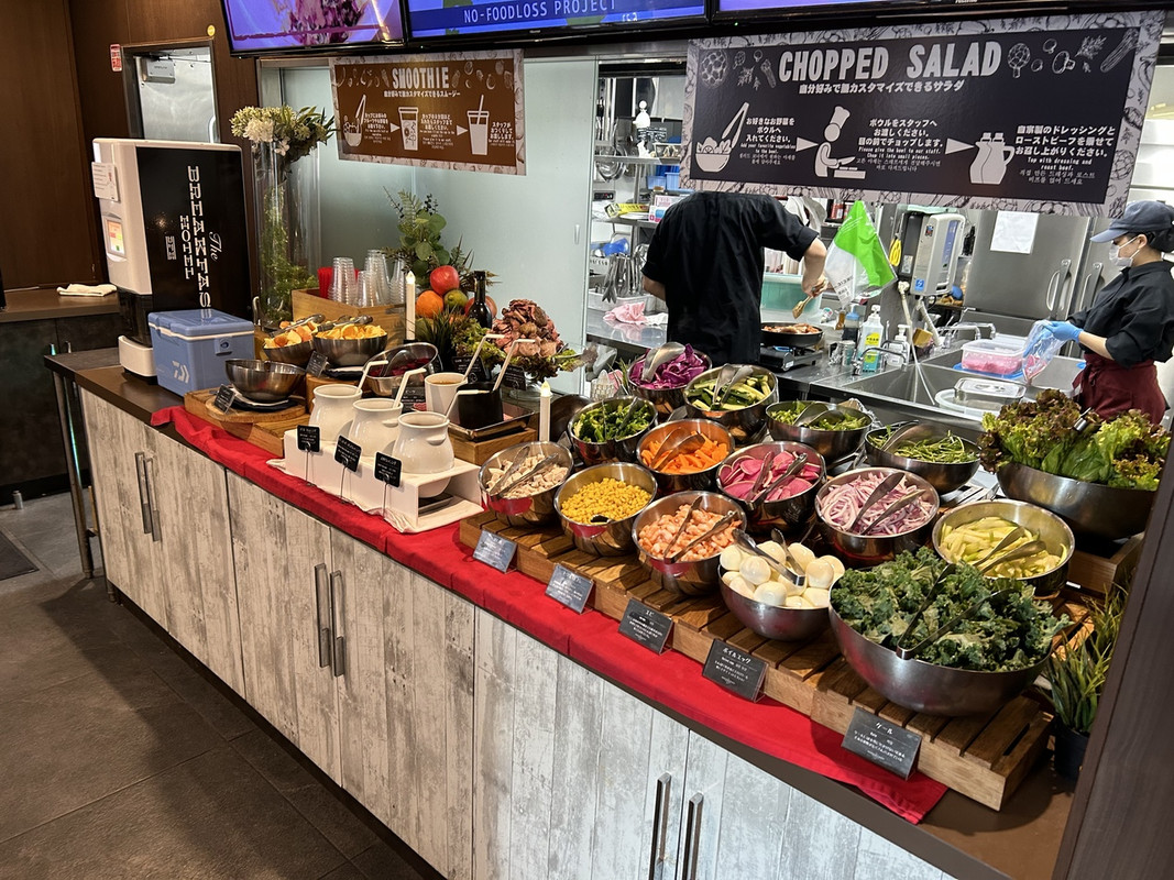 こちらのイタリアン朝食は、自分でトッピングを選ぶピザ、チョップドサラダ、ローストビーフ、スムージーが主力。