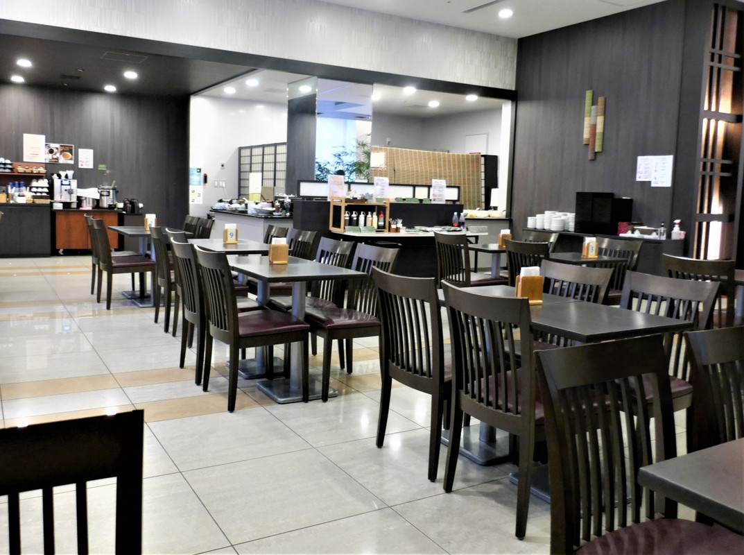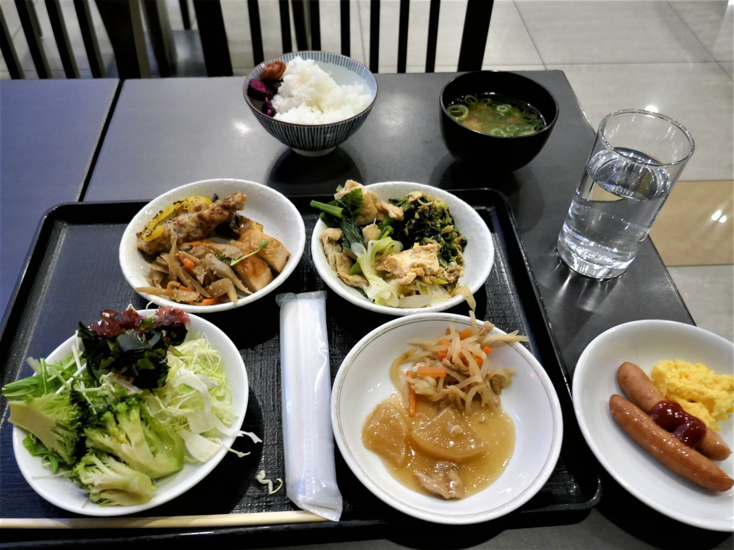 おばんざいメニューはビジネスホテルにありがちな塩っぱいものではなく、思ったよりも優しい味で美味しかったです。コーヒーマシンのコーヒーは部屋に持っていけるようにカップの他に紙コップも置いてありました。
