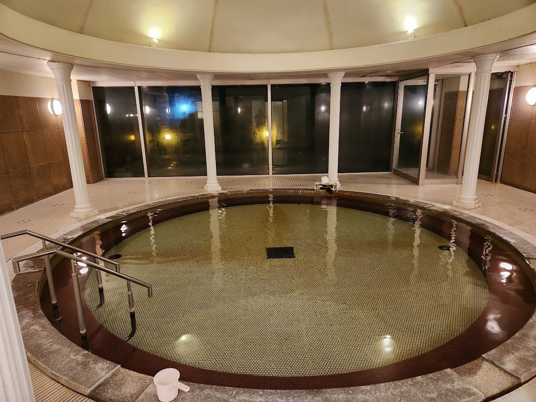 7、館内大浴場があって露天は屋根などが無いのでスーパームーンを満喫しながらゆっくりできた。内湯は円形で柱が神殿みたいな飾りで雰囲気が良い。洗い場も奥まった所にあるのでちょっと安心。(なんでか知らないが人が洗っているのをじっと見ている人が温泉各地に居る!不思議!!)