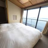 部屋は海に向かってツインベットのある和室だが、生憎天候が悪く海は鈍色に淀んでいた。