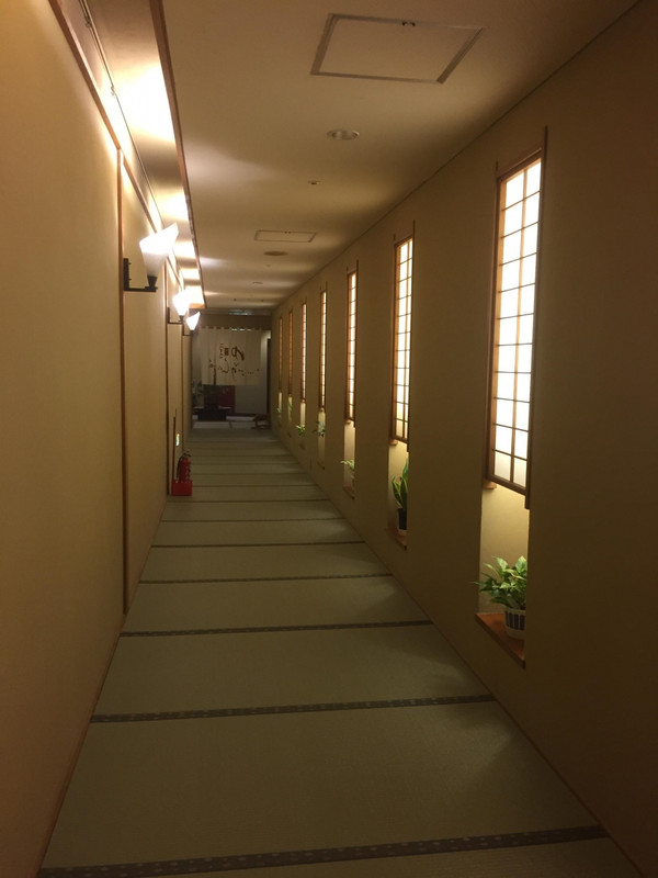 レストランに向かうのにフロント前(エントランス)を通ることはちょっと苦手です。私たちは浴衣姿、これからチェックインする人とひととき混在します。広いロビーとは仕切られた通路をすれ違う設計です。お土産売り場を過ぎて食事会場があります。夕食のうにの茶碗蒸し、にぎり寿司はとても美味しかったです。