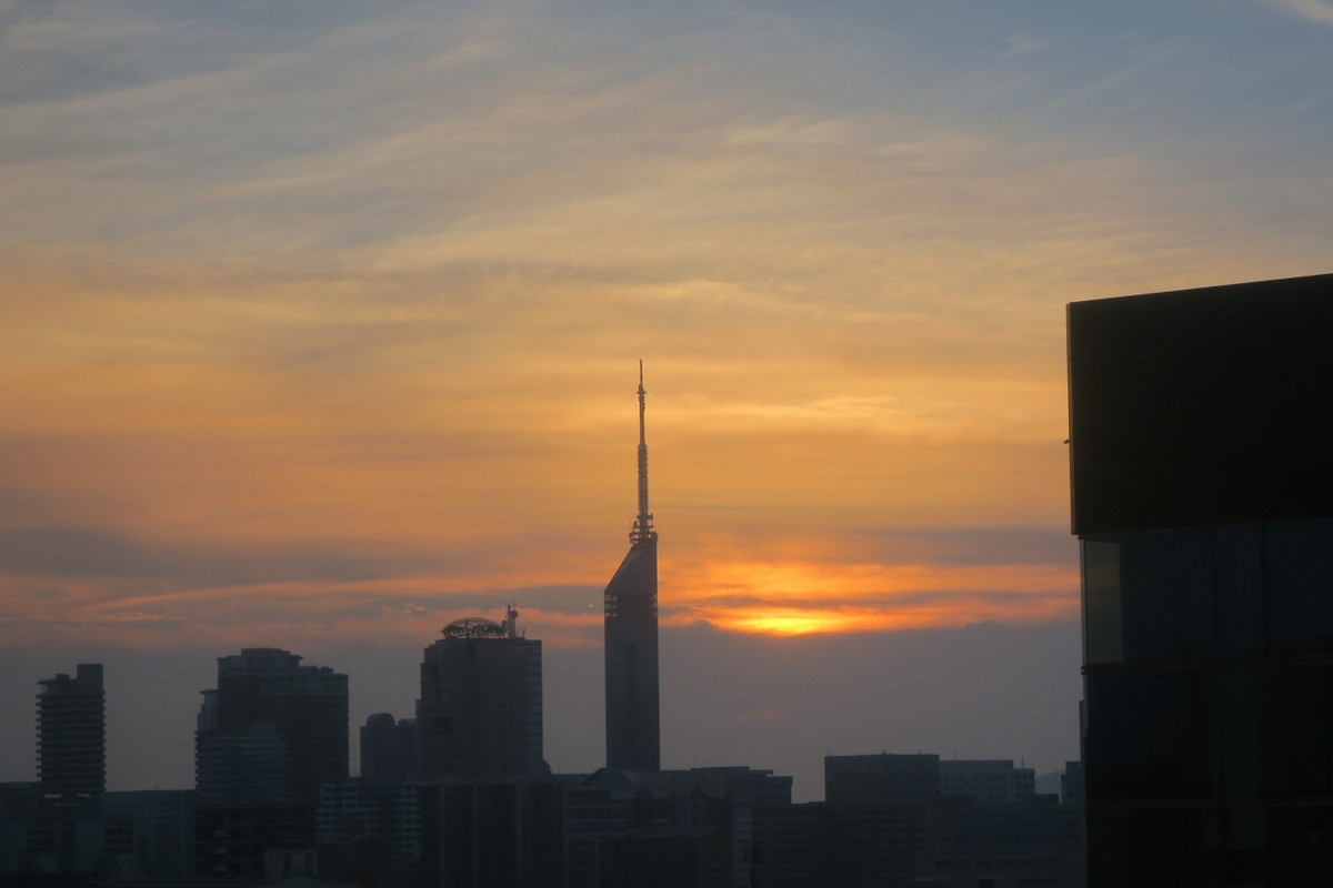 屋上のコインランドリーを使うため、夕刻に行ったら、ちょうど福岡タワーに夕陽がかかっていて、きれいな景色を見られました。1 / 2