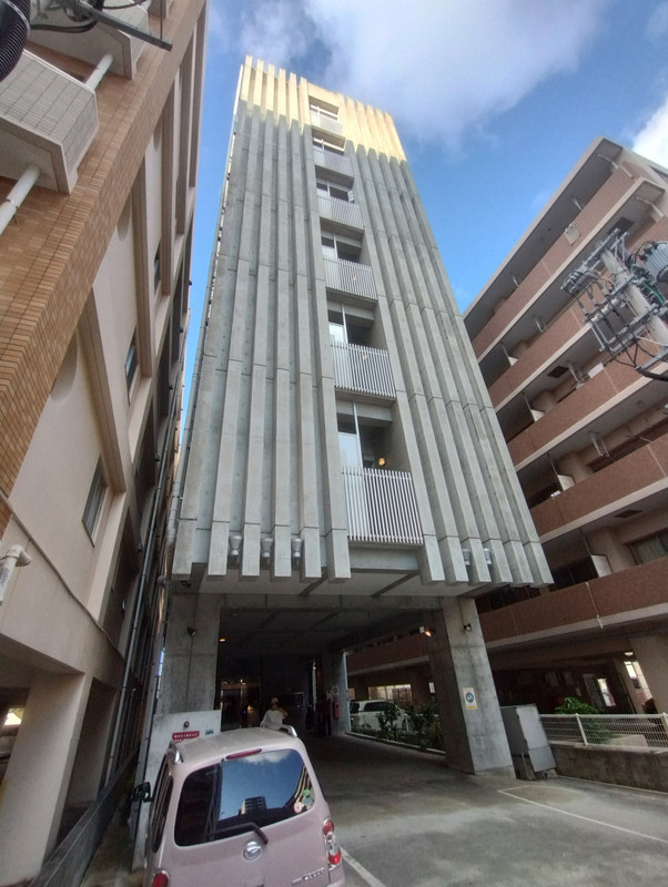 ゆいレール牧志駅・おもろまち駅から徒歩で15分ほどのNHK沖縄放送局の並びに在り、両側をビルに囲まれた間口の狭い7階建てホテルで通りには看板もあり判り易いです。